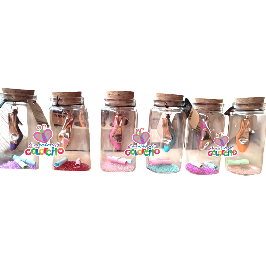 Recuerdos quince años. Botella con dije taco colores de metal. Las entregamos en bolsa de organza y tarjeta con los datos del evento en un adhesivo pegado en la botella. Medida: 6*3cm. aprox. Listas para regalar!!!