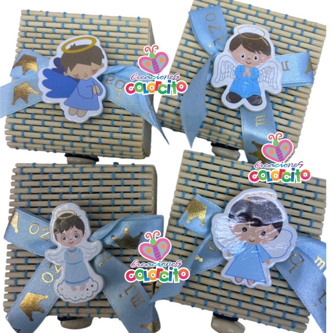 Bautizo – Mini cofre rustico con diseños variados celeste