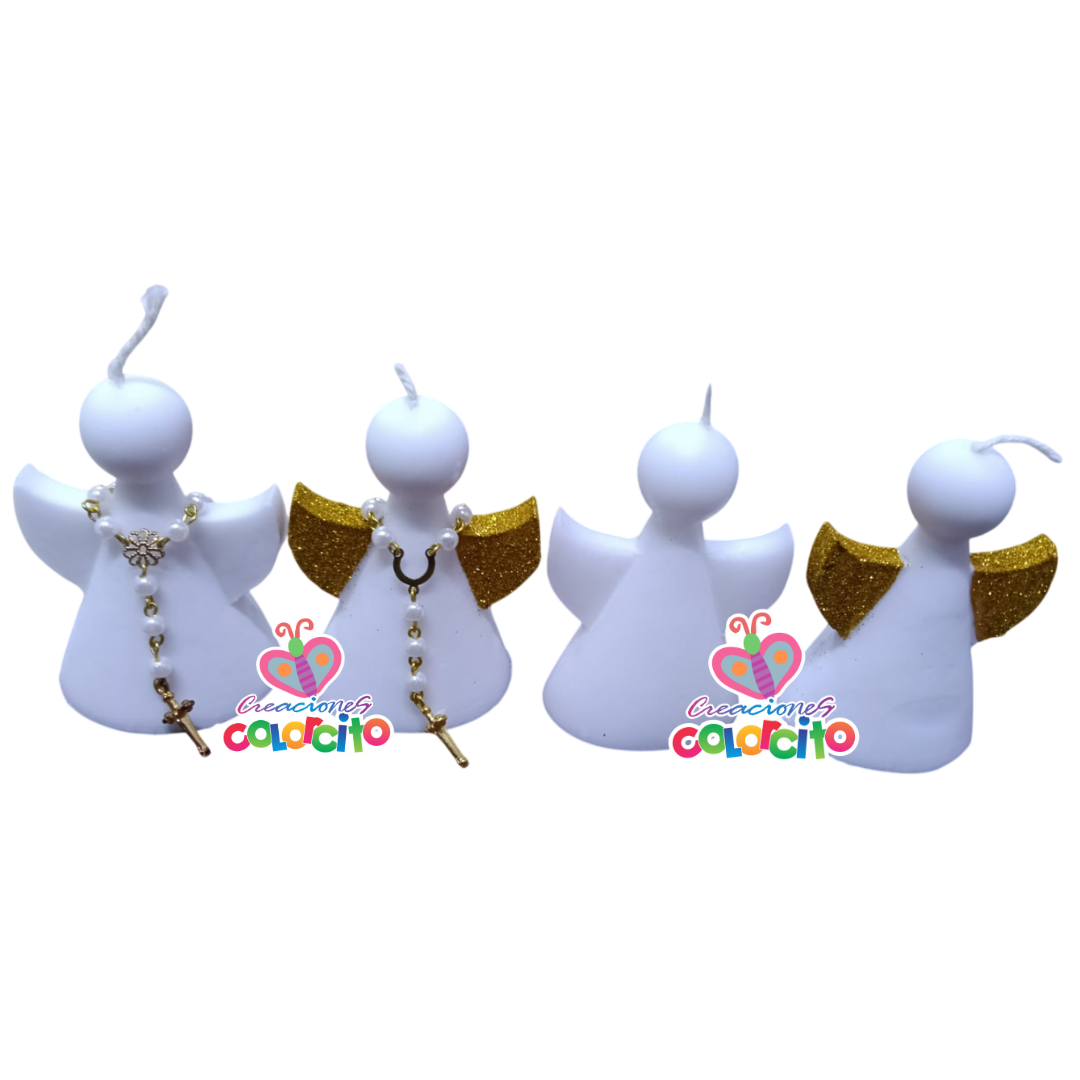 Recuerdos de bautizo – Vela en forma de angelito blanco y con dorado y con mini denario. Las entregamos en bolsa de organza y tarjeta los datos del evento. Listas para regalar!!!