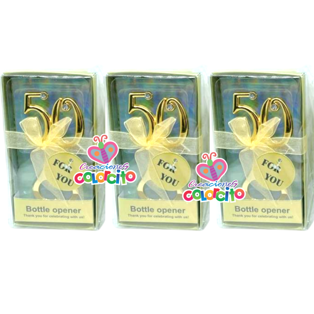 Recuerdos para matrimonio – Boda – Destapador 50 años. Van en bolsa de organza y tarjeta con los datos del evento. Listas para regalar!!!
