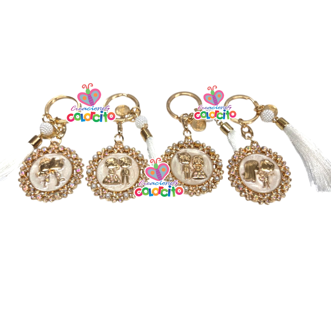 Recuerdos para matrimonio – Llaveros dorados diseño de novios variados con borla blanca. Van en bolsa de organza y tarjeta con los datos del evento. Listas para regalar!!!