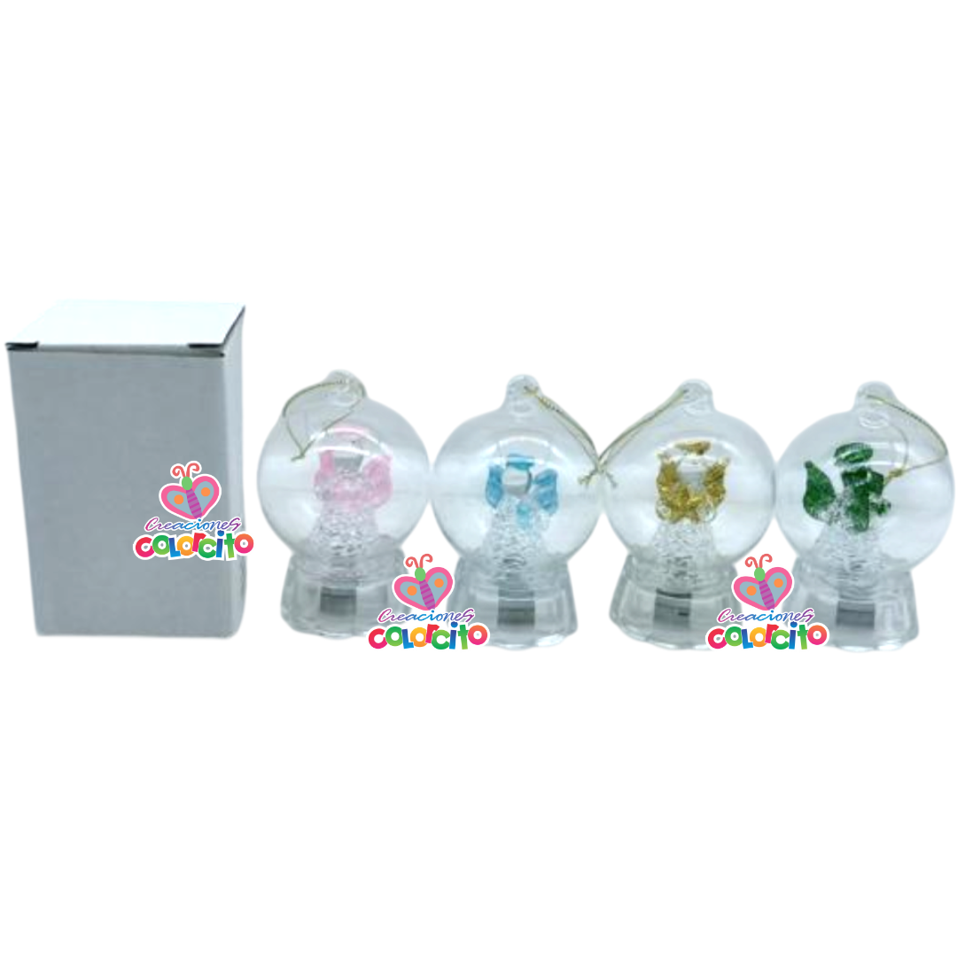 Recuerdos para misa de honras – Angelito de cristal colores cúpula redonda. Van en caja. Vienen en varios angelitos variados. Con una tarjeta los datos del evento.. Listas para regalar!!