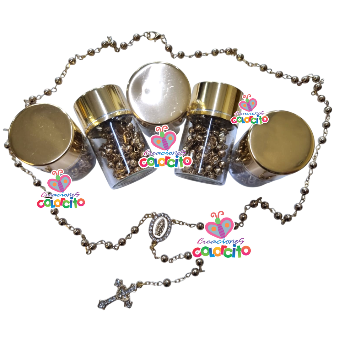 Recuerdos para misa de honras – Rosario dorado de metal en botella. Van en bolsa de organza y tarjeta con los datos del evento. Listas para regalar!!!