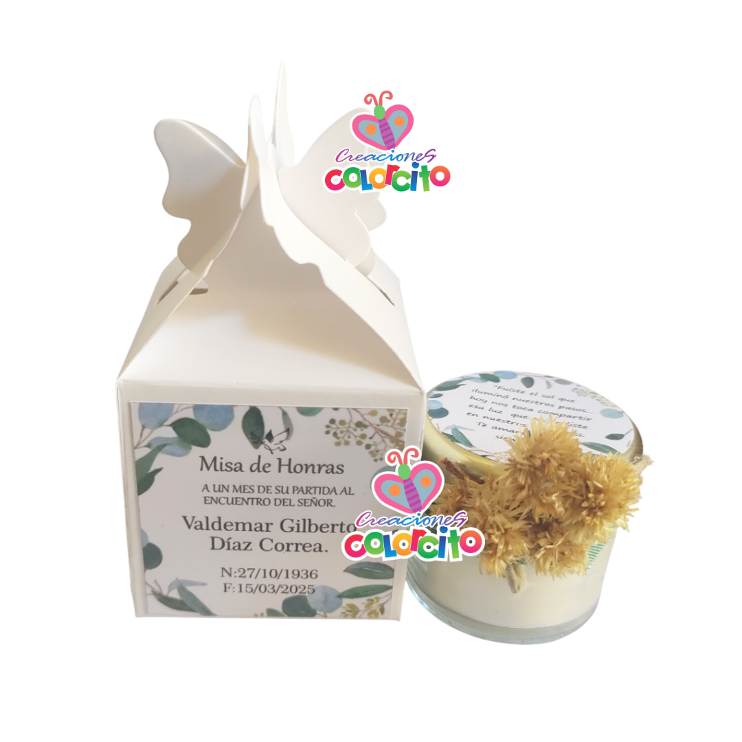 Recuerdos misa de honras. Vela en frasco de 20ml. con tapa color, lazo y aplique flores secas. Con adhesivo la tapa. Viene dentro de su caja y etiqueta personalizado. Medidas 5×3.5cm. aprox.