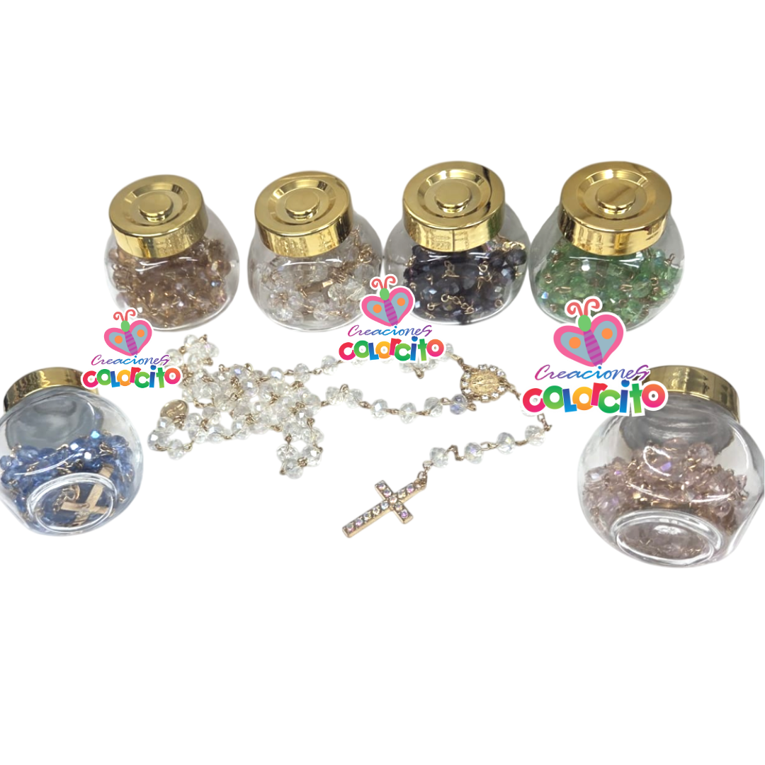 Recuerdos de misa. Rosario de murano colores en frasco con adhesivo los datos del evento y en bolsa de organza. Listas para regalar !!!