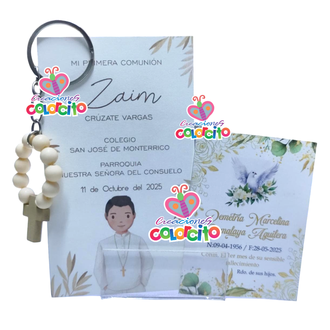 Primera Comunión – Estampa y llavero denario Set Vainilla , Incluye una estampa personalizada, un llavero denario crema, ambos van en bolsa de organza. Listas para regalar!!!
