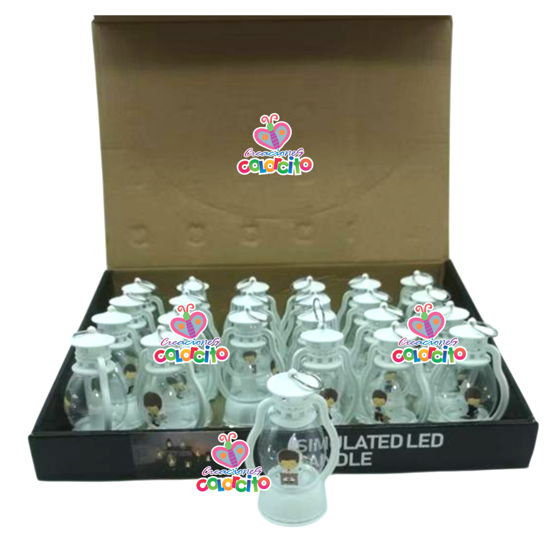 Primera Comunión – Lampara led blanco diseños varios. Las entregamos en bolsa de organza y tarjeta con los datos del evento. Medida: 8*4cm. aprox. Listas para regalar!!!