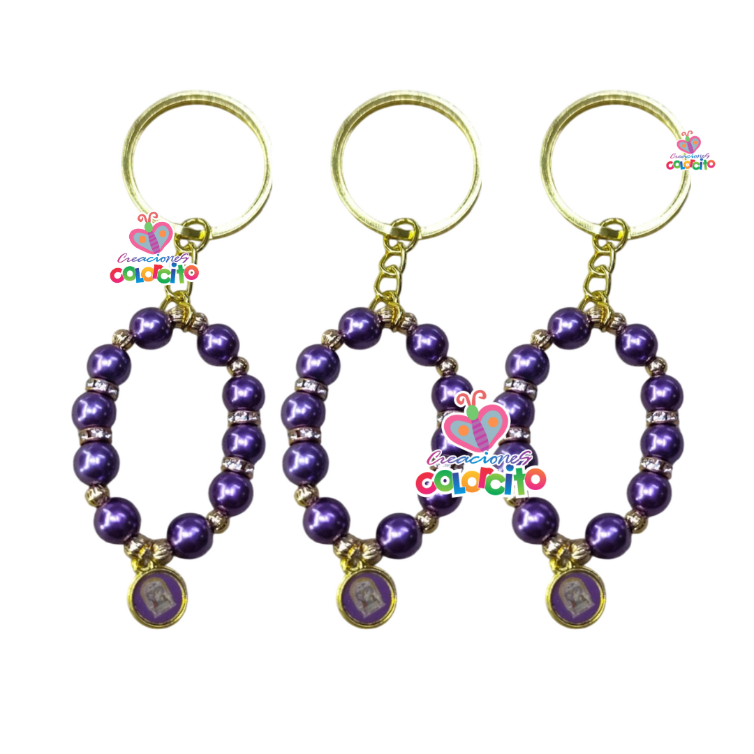Primera Comunión – Llavero perlas morado denario dije señor de los milagros