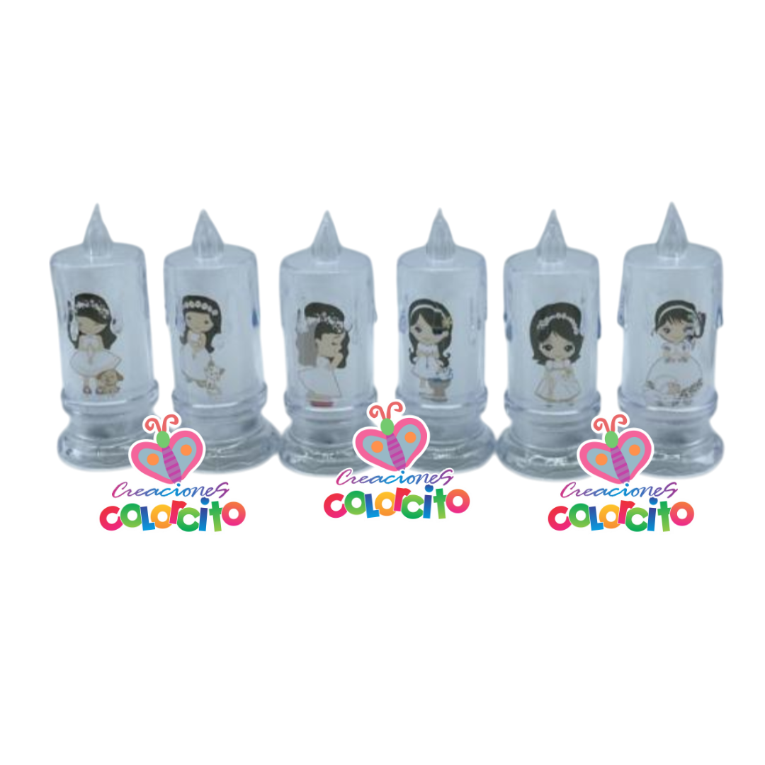 Recuerdos de primera comunión – Velas led luz calida imagenes niñas viene dentro de su bolsa de organza con tarjeta adhesiva. Medidas 7x4cm. aprox. Listas para regalar!!!