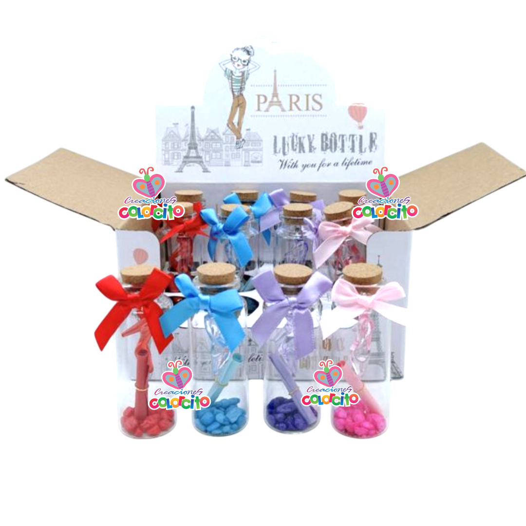 Recuerdos de quinceañeras. Botellas con lazo colores dije taco acrílico. Van en bolsa de organza con adhesivo los datos del evento. Listas para regalar!!!